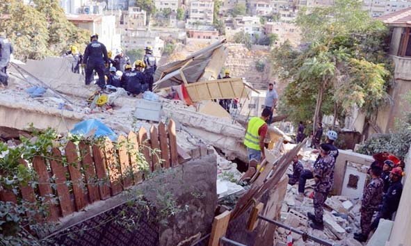 عمان:اردن کے دارلحکومت عمان میں منگل کو چار منزلہ رہائشی عمارت گرنے سے 5 افراد ہلاک اور 14 زخمی ہوگئے۔غیر ملکی میڈیا کے مطابق عمان؎کے اللویبدہ علاقے میں چار منزلہ