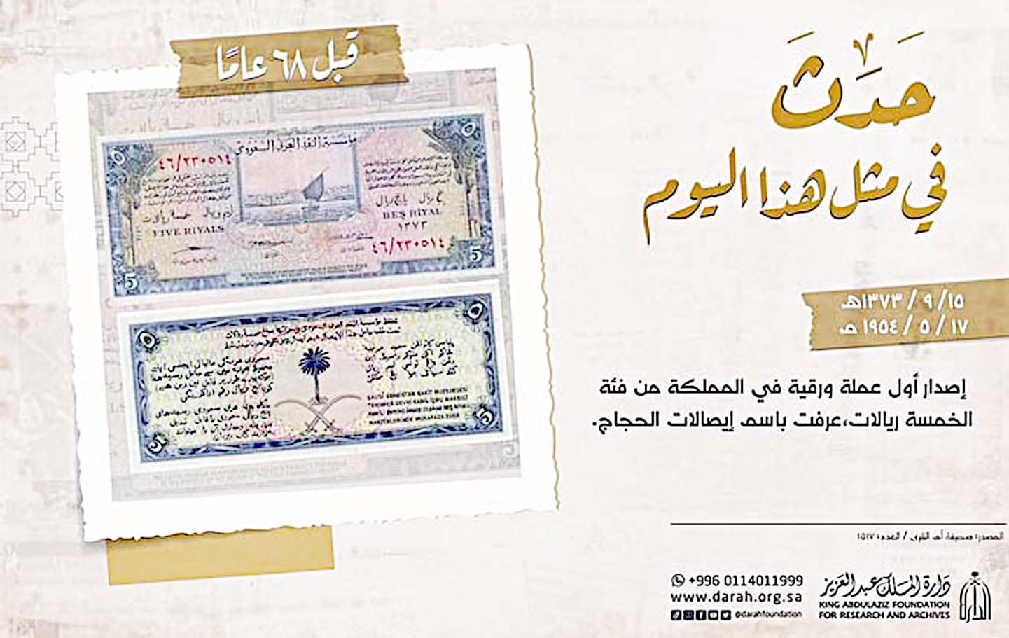 ریاض : 68 سال پہلے آج کے دن یعنی 17 مئی کو سعودی عرب نے 5 ریال کا پہلا کرنسی نوٹ جاری کیا تھا۔میڈیا کے مطابق مذکورہ کرنسی نوٹ پر