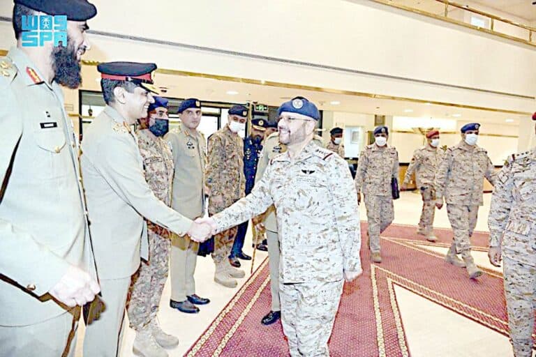 ریاض : سعودی عرب کی مسلح افواج کے چیف آف جنرل اسٹاف لیفٹیننٹ جنرل فیاض بن حمید الرویلی سے پاکستانی مسلح افواج کے چیئرمین جوائنٹ چیفس آف اسٹاف کمیٹی لیفٹیننٹ