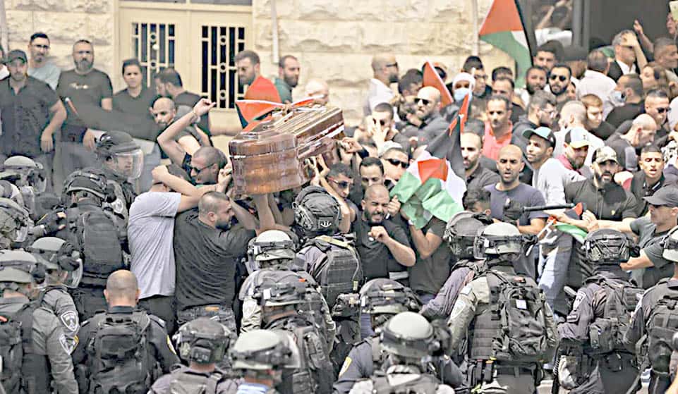 ہزاروں سوگوار‘ جس میں بعض فلسطینی پرچم تھامے ہوئے فلسطین فلسطین کے نعرے لگارہے تھے شیرین ابوعقیلہ کے جنازے میں شامل ہوئے ہیں۔یروشلم۔الجزیرہ کی صحافی شیرین ابو عقیلہ کے جلوس