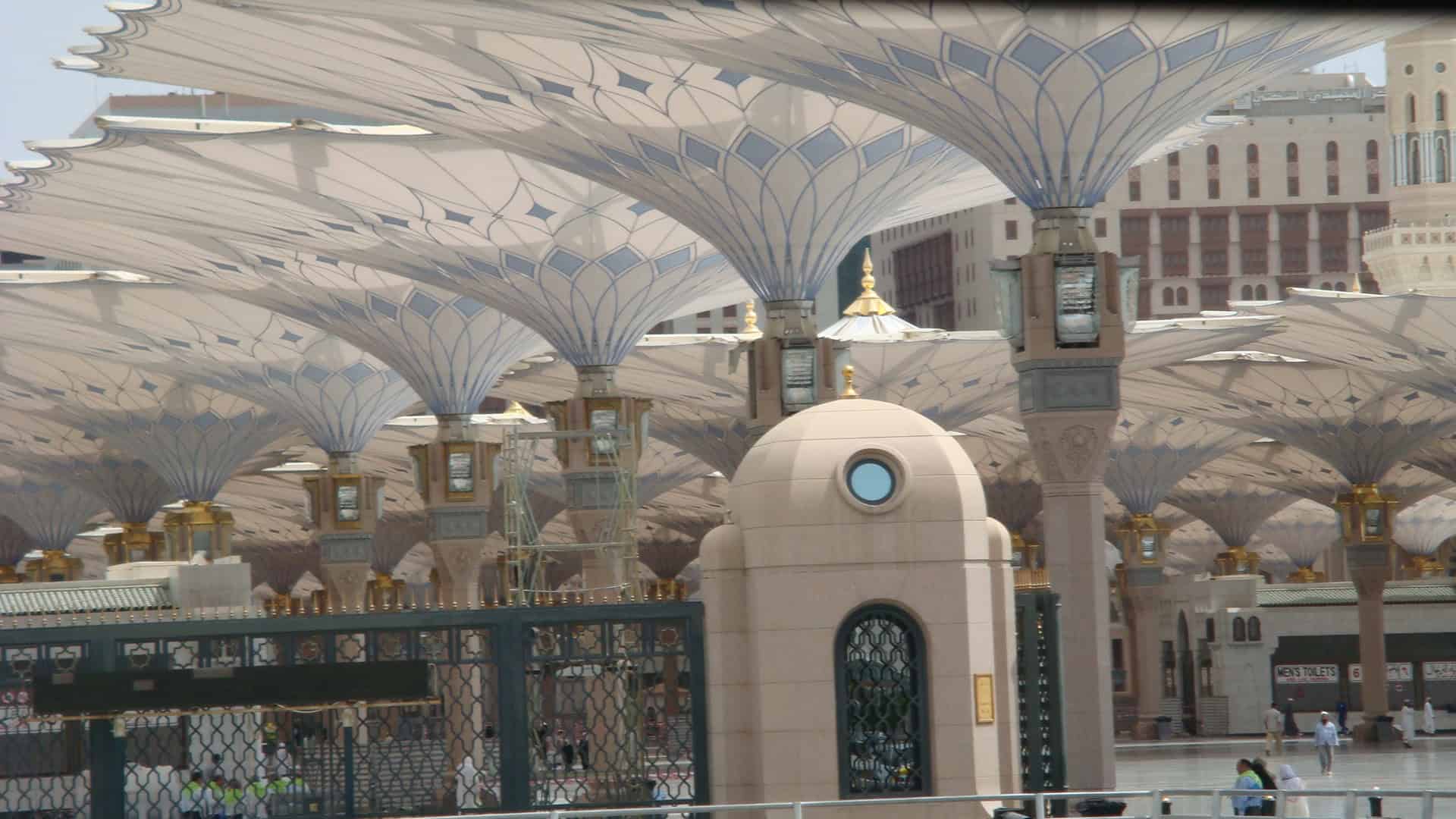 ریاض : مدینہ منورہ میں مسجد نبوی ﷺکے صحنوں میں نصب ضخیم چھتریاں زائرین اور نمازیوں کو دھوپ اور بارش سے بچاتی ہیں اور مسجد کے صحنوں میں ان افراد