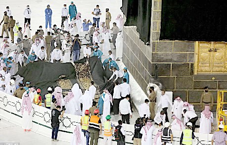ریاض: سالانہ معمول کے مطابق چہارشنبہ اور جمعرات کی درمیانی شب غلاف کعبہ تبدیل کردیاگیا۔ مسجد الحرام و مسجد نبویؐ امور کی جنرل پریذیڈنسی کی نگرانی میں یہ کام انجام