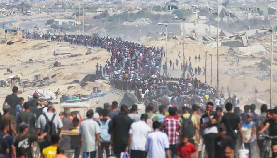 لوگوں کا ایک مستقل سلسلہ، جس کی اکثریت پیدل چل رہی ہے، وسطی غزہ کی پٹی میں ایک ساحلی سڑک پر چڑھ گئی، یہ دیکھنے کے لیے کہ ان کے