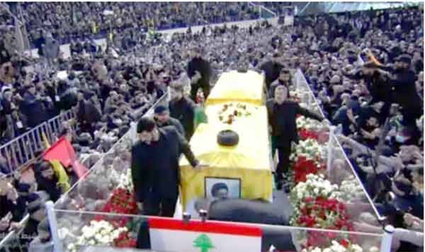 اتوار کے روز، دسیوں ہزار حامیوں نے 55,000 نشستوں والے کیملی چمون اسپورٹس سٹی اسٹیڈیم میں حزب اللہ کے جھنڈے لہرائے اور نصر اللہ کی تصاویر اٹھا رکھی تھیں۔ بیروت: