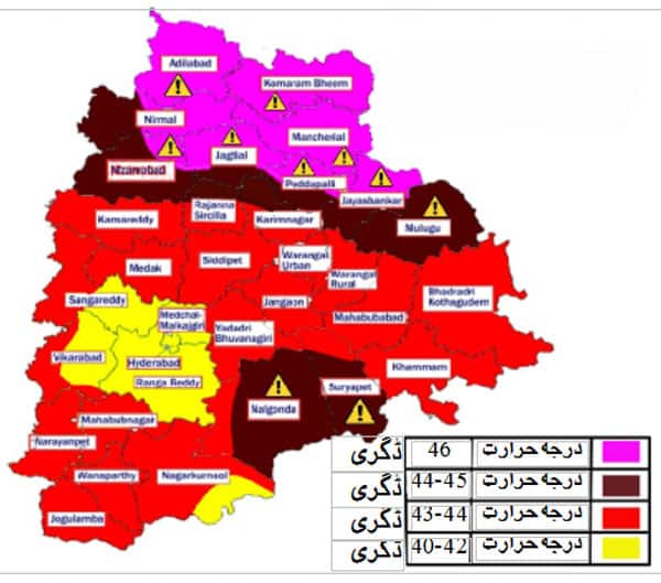 29 اپریل تا 3 مئی شمالی تلنگانہ کے اضلاع میں شدید گرمی کی لہر رہے گیجہاں اعظم ترین درجہ حرارت 47 ڈگری سنٹی گریڈ تک پہونچ جائے گاحیدرآباد میں اعظم
