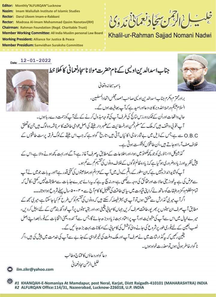 یقینی کامیابی والی نشستوں پر ہی توجہ اور دیگر پرعظیم اتحاد کیلئے اپیل کا مشورہ صدر مجلس بیرسٹر اسد الدین اویسی کے نام مولانا سجاد نعمانی کا کھلا مکتوب حیدرآباد۔12