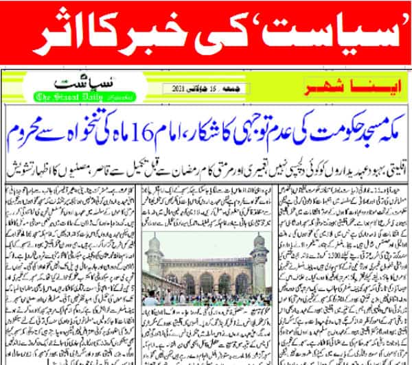 ملازمت میں توسیع کی فائیل فینانس میں زیر التواء، مینٹننس فنڈ سے 2 لاکھ 17 ہزار کی اجرائی، ملازمین اور مصلیوں کا ’سیاست‘ سے اظہار تشکرحیدرآباد۔/20 جولائی، ( سیاست نیوز)