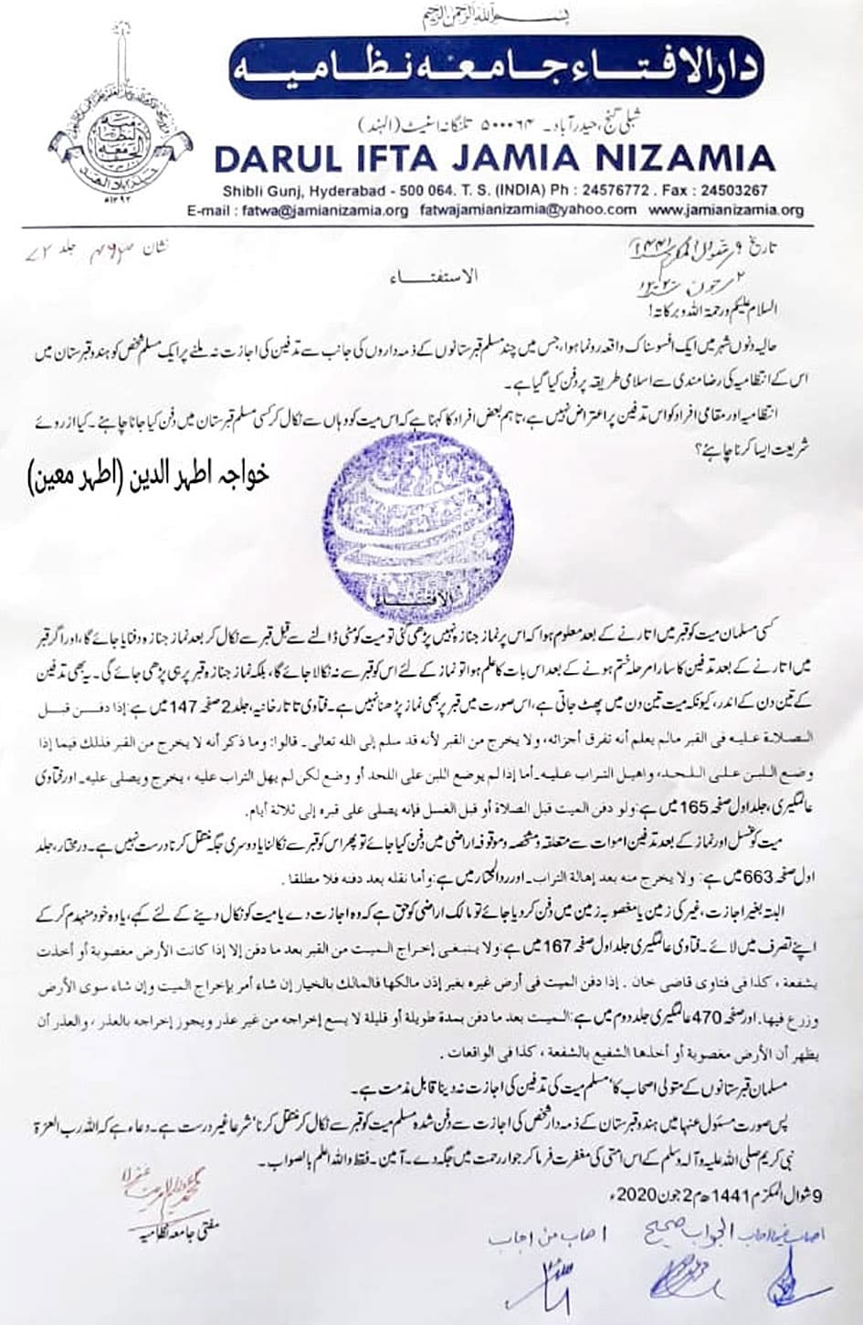 مسلم قبرستان میں تدفین کی اجازت نہ دینے کی مذمت : جامعہ نظامیہ حیدرآباد ۔ 2 جون (سیاست نیوز) شہر کے نواحی علاقہ میں شمشان گھاٹ میں مسلم میت کی