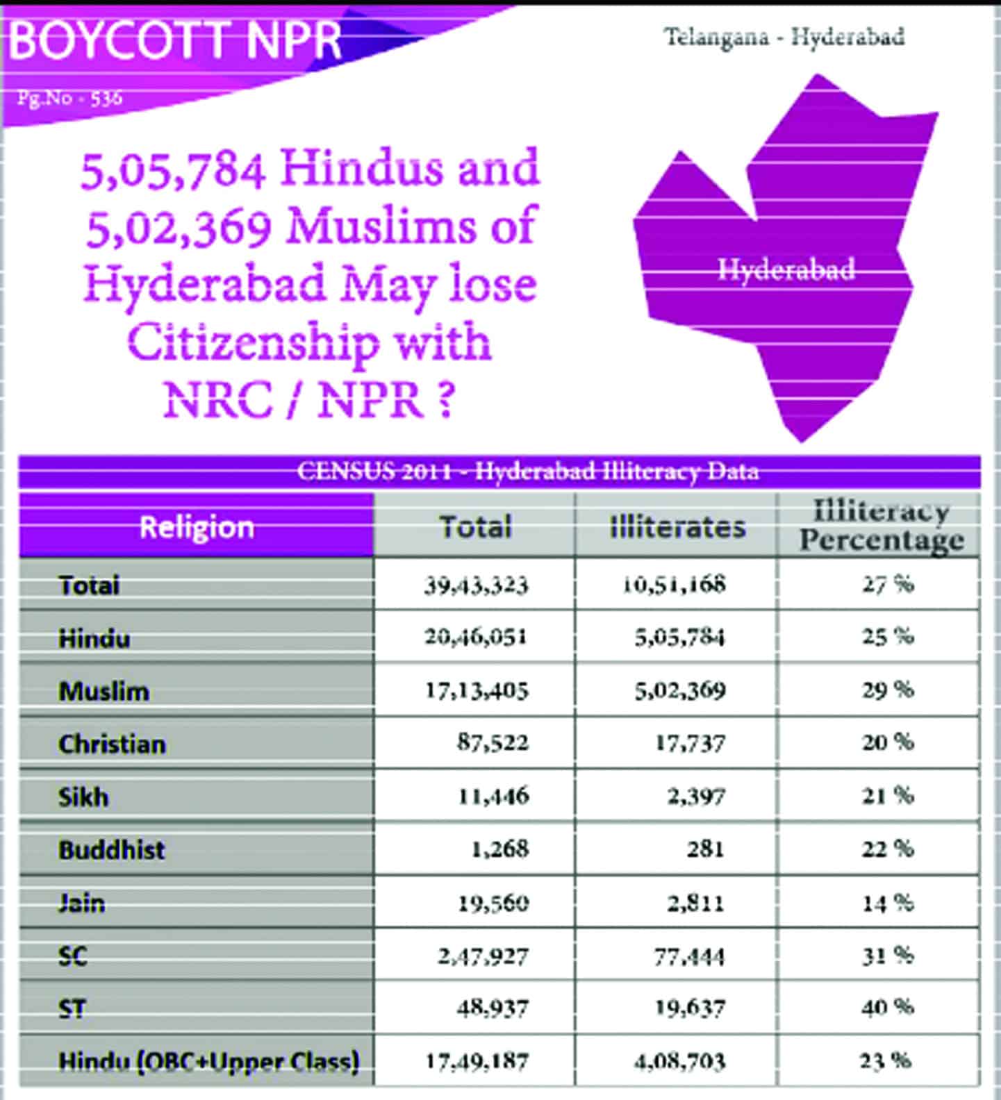 حیدرآباد میں 505784 ہندو اور 502369 مسلمان متاثر ہوں گے، جناب خالد سیف اللہ کا تجزیہ حیدرآباد۔5فروری(سیاست نیوز) این پی آر کی صورت میں شہر حیدرآباد کی آبادی کا جائزہ