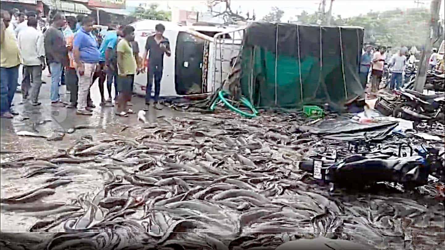 حیدرآباد24ستمبر(یواین آئی)تلنگانہ کے ضلع محبوب آبادمیں بڑی تعداد میں مچھلی لے جانے والی لاری الٹ گئی جس کے ساتھ ہی مقامی افرادسڑک پر گری مچھلیوں کو لوٹنے لگے ۔بعض مقامی
