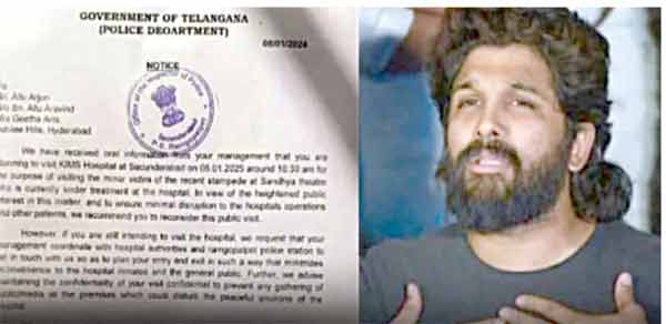 حیدرآباد۔/5 جنوری، ( سیاست نیوز) پولیس رام گوپال پیٹ نے فلم اسٹار الوارجن کو نوٹس جاری کرتے ہوئے کمس ہاسپٹل میں زیر علاج سری تیجا کی عیادت سے روک دیا