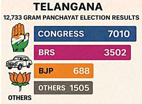 12,733 کے منجملہ 7010 سرپنچ نشستوں پر کانگریس کی کامیابی، 3502 نشستوں کے ساتھ بی آر ایس دوسرے مقام پربی جے پی صرف 688 سرپنچوں تک محدود، آزاد و دیگر