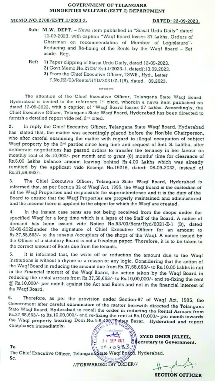 احکامات واپس لینے وقف بورڈ کو ہدایت،بقایا جات کی کمی اور کم کرایہ مقرر کرنا وقف ایکٹ کی خلاف ورزی، عمرجلیل کے احکامات( سیاست کی رپورٹ کا اثر ) حیدرآباد۔/22