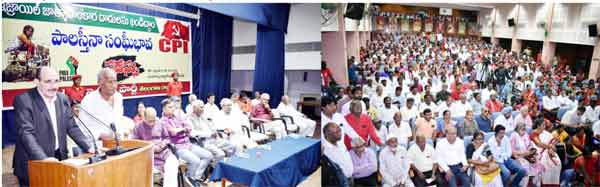عالمی طاقتوں سے مداخلت کی اپیل، سی پی آئی کا جلسہ اظہار یگانگت، فلسطینی سفیر عدنان محمد اور ڈی راجہ کا خطابحیدرآباد ۔ 5 ۔ فروری(سیاست نیوز) فلسطینی عوام سے