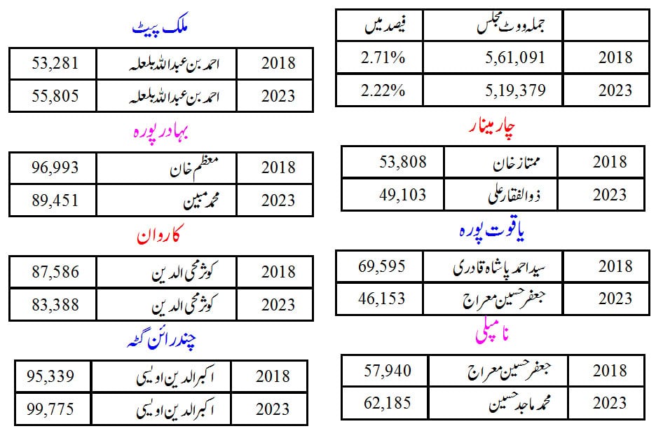 2018 اور 2023 میںمحصلہ ووٹ کا تقابلی جائزہحیدرآباد۔5۔ڈسمبر۔(سیاست نیوز) شہر میں مجلس اتحادالمسلمین کی مقبولیت میں نمایاں کمی واقع ہوئی ہے۔ اسمبلی انتخابات میں گذشتہ کے مقابلہ میں مجلس اتحاد