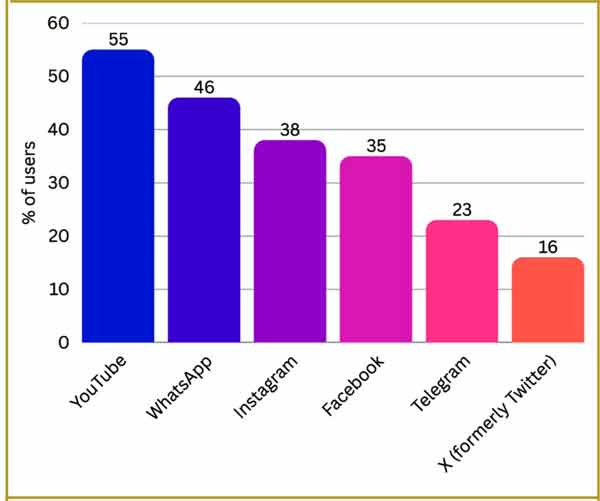 55 فیصد یوزرس کا یو ٹیوب کا استعمال ، واٹس ایپ یوزرس کی تعداد 46 فیصدحیدرآباد ۔30 ۔ مارچ (سیاست نیوز) سماج میں سوشیل میڈیا کے استعمال کے ذریعہ خبروں