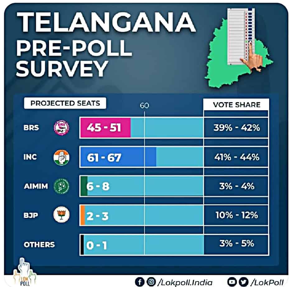 لوک پول ایجنسی کا سروے، تلنگانہ میں کانگریس کو 61 تا 67 اور بی آر ایس کو 45 تا 51 نشستوں پر کامیابی کا امکان، مجلس کو 6 تا 8