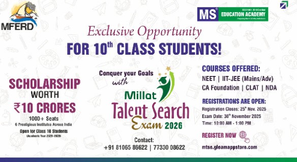 قومی سطح پرملّت ٹیلنٹ سرچ امتحان 2026کے ذریعہ دس کروڑ روپئے کے اسکالرشپسحیدرآباد۔ 29 اکٹوبر (پریس نوٹ ) ۔ ملّت فاؤنڈیشن فار ایجوکیشن، ریسرچ اینڈ ڈیولپمنٹ (MFERD) نے دسویں جماعت