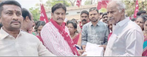 کوتہ گوڑم /16 مارچ ( سیاست ڈسٹرکٹ نیوز ) بھدرادری کتہ گوڈم میںتحصیلدار آفس پر دھرنا کر تے ہوئے سی پی آئی ریاستی سکریٹری کوٹم سامبا راؤ نے اپنے ایک