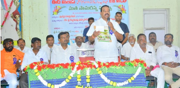 کریم نگر میں منعقدہ تقریب سے مختلف مقررین کا خطاب کریم نگر ۔ عید ملاپ پروگرام کے ذریعہ ہندو ۔ مسلم یکجہتی اور امن و امان کی برقراری کے لئے