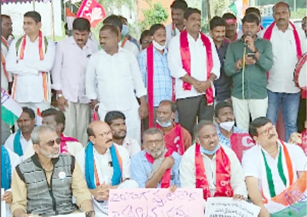 نظام آباد میں کل جماعتی قائدین کا احتجاجی مظاہرہ نظام آباد :۔یس ٹی( گریجن )طبقہ کو اراضیات کے پٹہ جات کی منظوری کا مطالبہ کرتے ہوئے آج کل جماعتی قائدین