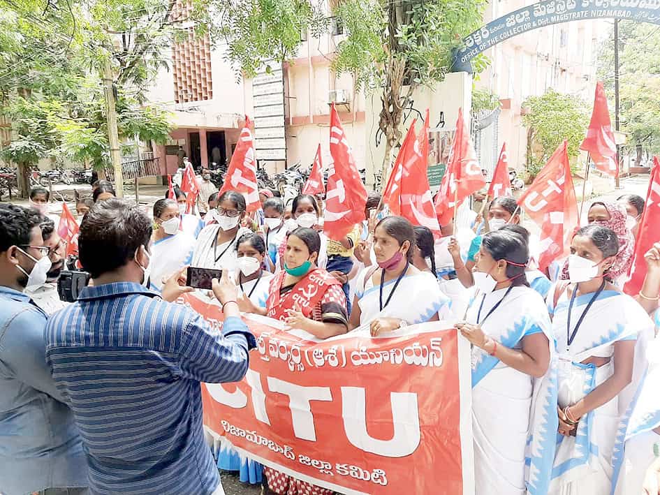 نظام آباد: سی آئی ٹی یو کی جانب سے آشا ورکرس ، کمیونٹی ہیلت ورکرس ، والینٹرس کے مطالبات کی یکسوئی کا مطالبہ کرتے ہوئے کلکٹریٹ پر دھرنا دیا گیا