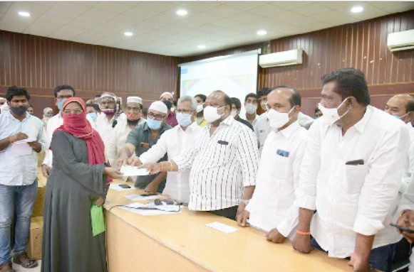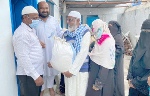 جنگاؤں۔ رمضان المبارک کے پہلے روزہ کے دن محمد جمال شریف ایڈوکیٹ و صدر ایکمینار مکہ مسجد جنگاؤں کے مکان کے پاس غریب مسلمانوں میں راشن کٹس تقسیم کئے گئے۔