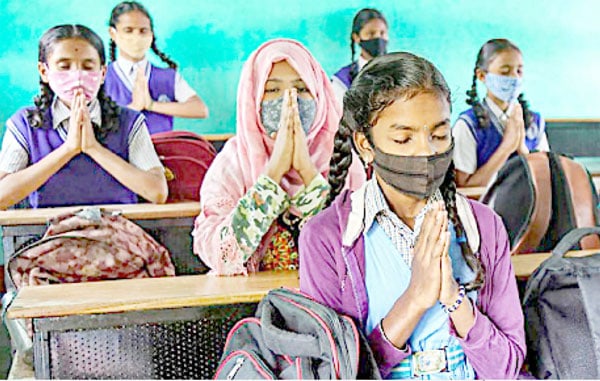 بنگلورو میں پیر کو اسکولوں کی کشادگی پر ایک جماعت کی طالبات خدا کے آگے دعا گو ہیں ۔ شاید وہ اپنی صحت کے ساتھ ساتھ کورونا وائرس کے خاتمہ