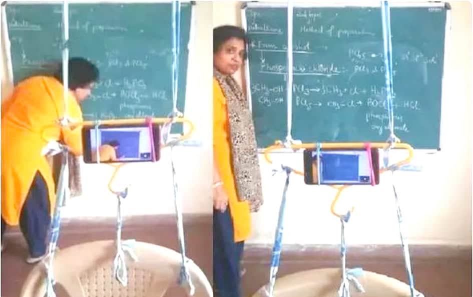 ٭ مہاراشٹرا میں پونے کی ایک کیمسٹری ٹیچر نے لاک ڈاؤن کے دوران آن لائن کلاسیس کی ریکارڈنگ کیلئے اختراعی انتظام کیا ہے جس میں اس نے ہینگر، کرسی اور