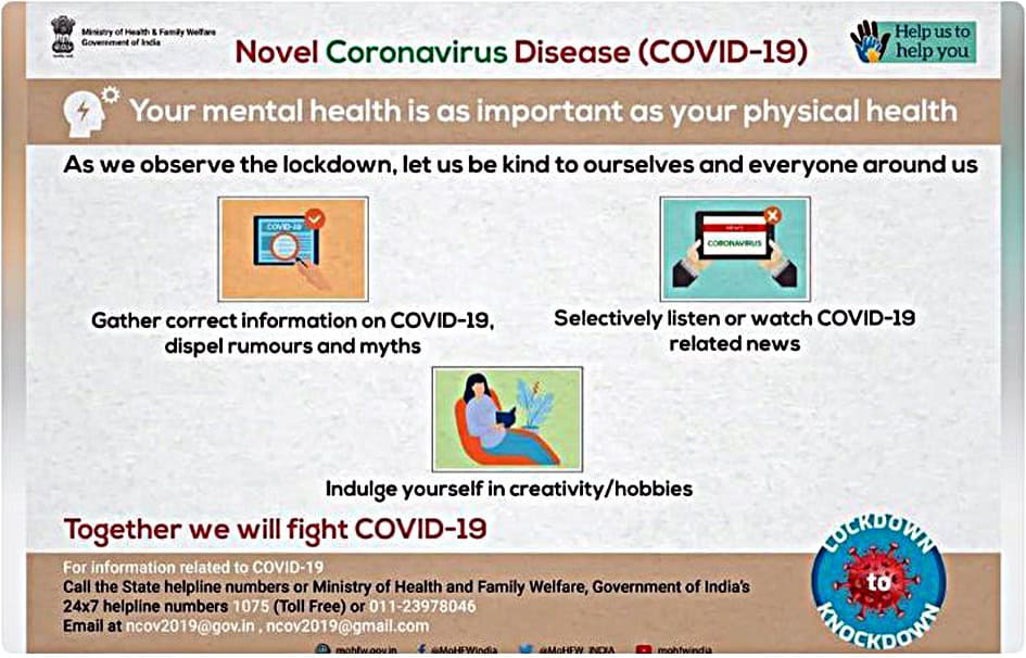 اپنے مشغلوں پر دوبارہ توجہ دیں : وزارت صحت ٭ مرکزی وزارت صحت نے کہا کہ موجودہ حالات میں مختلف قسم کے ذہنی مسائل کو لیکر تشویش کا شکار ہونا
