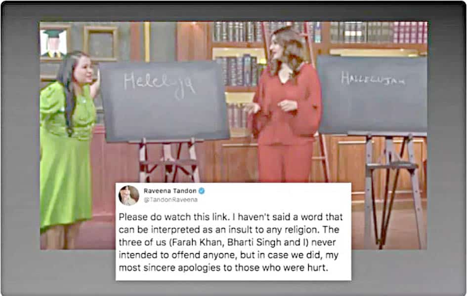 ٭٭ ایک شو کے دوران بالی ووڈ اداکارہ روینہ ٹنڈن ، فرح خان اور بھارتی سنگھ کی جانب سے عیسائی برادری کے مذہبی جذبات کومجروح کرنے پر ایف آئی آر