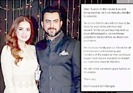ممبئی۔یکم اگست (سیاست ڈاٹ کام) فلمی اداکارہ دیا مرزا نے جمعرات کو اپنے شوہر ساحل سنگھا سے علیحدگی کا اعلان کردیا۔ ان کی شادی ہوکر کوئی 4 سال کا عرصہ