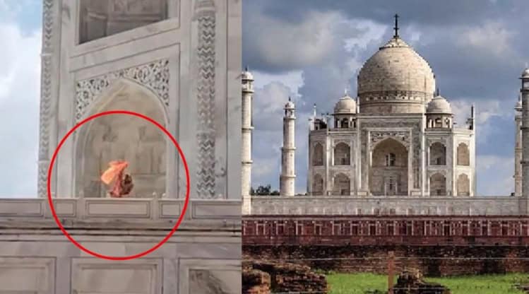 نئی دہلی: ایک خاتون نے آگرہ کے تاج محل کے گنبد پر گنگا جل چڑھایا اور پھر زعفرانی رنگ کپڑا ہوا میں لہرایا۔ جب وہ بھگوا کپڑا لہرا رہی تھی