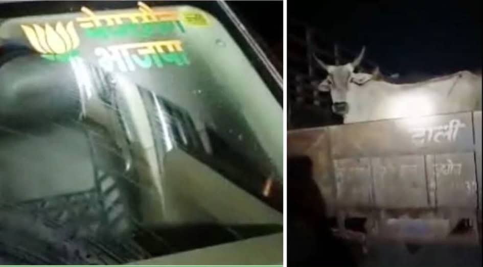 بھگوا پارٹی کا اسٹیکر لگی گاڑی کے ذریعہ منتقلی کی کوشش لکھنؤ: اترپردیش کے بریلی میں 12 گائیوں کو ٹرالی کے ذریعے اسملنگ کیا جارہا تھا کہ گاؤں والوں نے