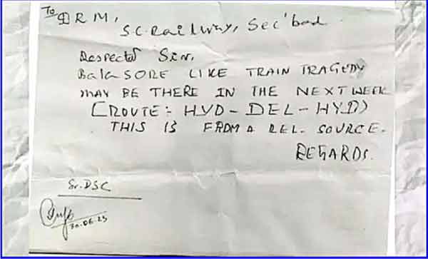 گمنام خط ملنے کے بعد تمام زونز کے ڈیویژنل ریلوے منیجرس کی ہنگامی جائزہ میٹنگ نئی دہلی: ساؤتھ سنٹرل ریلوے کو ایک گمنام خط موصول ہوا ہے جس میں حیدرآباد۔دہلی