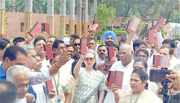 نئی دہلی: اٹھارویں لوک سبھا کا پہلا اجلاس پیر کو شروع ہوتے ہی انڈیا اتحاد کے لیڈروں نے پارلیمنٹ کے احاطے میں اپنے ہاتھوں میں آئین کی کاپی پکڑ کر