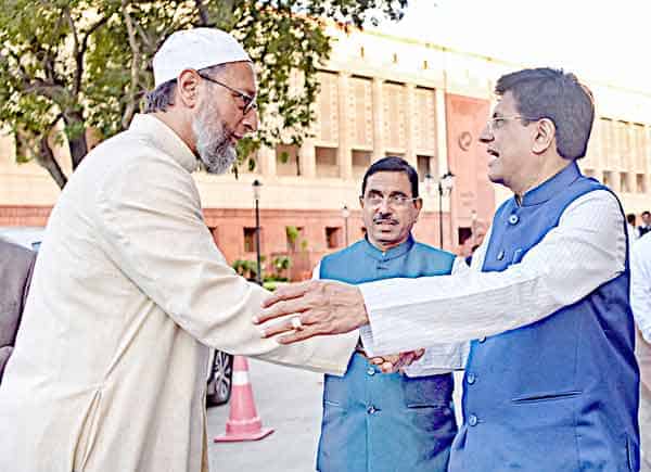 راجیہ سبھا کے قائد ایوان پیوش گوئل پارلیمنٹ ہاؤس میں پیر کو خصوصی سیشن کے پہلے روز مجلس کے ایم پی اسدالدین اویسی کا استقبال کرتے ہوئے ۔ وزیر پارلیمانی