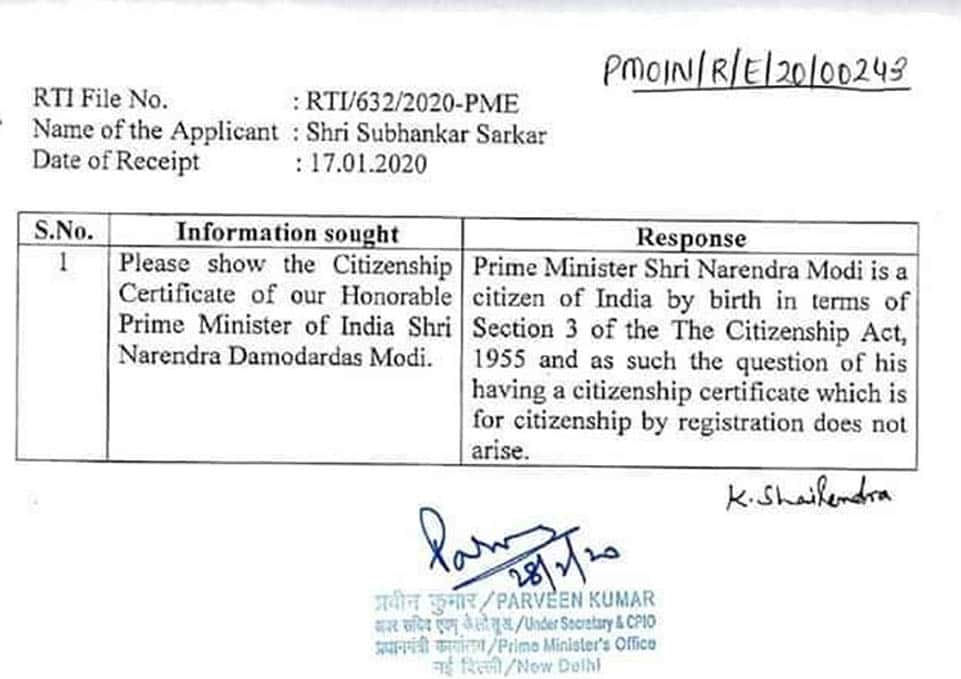 آر ٹی آئی ایکٹ کے تحت ایک شہری کے سوال پر وزیراعظم کے دفتر کا جواب نئی دہلی 28 فروری (سیاست ڈاٹ کام) مرکز کی بی جے پی حکومت کی