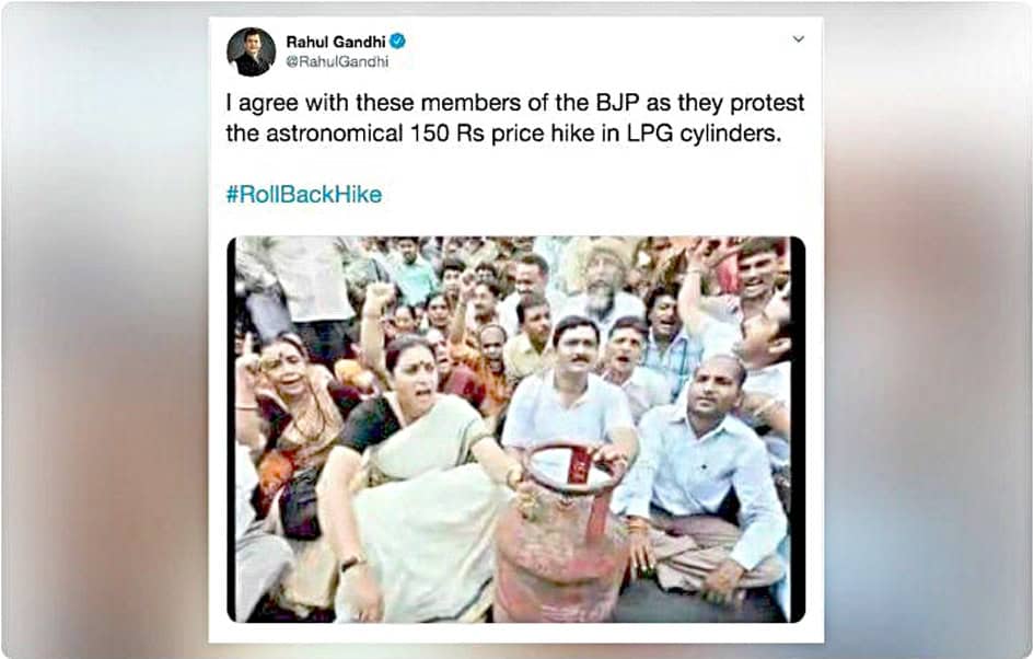 ٭ کانگریس لیڈر راہول گاندھی نے جمعرات کو مرکزی وزیر سمرتی ایرانی کی ایک پرانی تصویر ٹوئیٹ کی جس میں وہ ایل پی جی قیمت میں ماضی میں کئے گئے