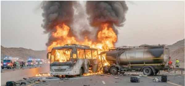 حجاج کرام جس بس میں مکہ مکرمہ سے مدینہ منورہ جا رہے تھے وہ ڈیزل ٹینکر سے ٹکرا گئی۔ حیدرآباد: ایک المناک واقعہ میں، مدینہ منورہ میں پیش آنے والے