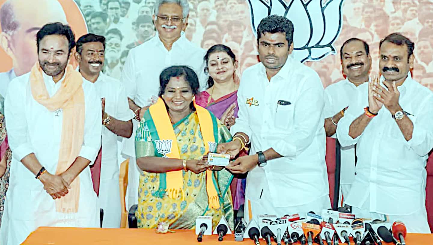مرکزی وزیر کشن ریڈی نے کھنڈوا پہنایا، لوک سبھا چناؤ میں مقابلہ کے امکانات حیدرآباد۔/20 مارچ، ( سیاست نیوز) تلنگانہ کی سابق گورنر ڈاکٹر ٹی سوندرا راجن نے آج باقاعدہ