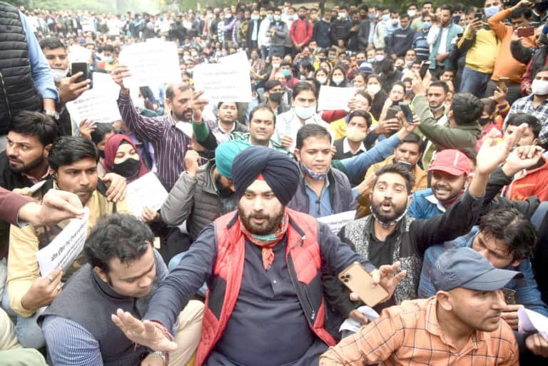 نئی دہلی : پنجاب کانگریس کے صدر نوجوت سنگھ سدھو اتوارکو وزیراعلی اروند کیجریوال کی رہائش گاہ کے سامنے دہلی کے سرکاری اسکولوں کی مہمان اساتذہ(گیسٹ ٹیچرس) کے احتجاجی مظاہرہ