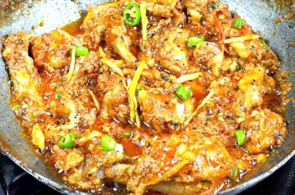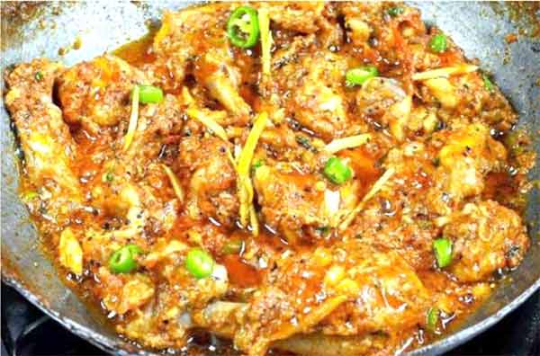 اجزا : چکن ایک کلو، نمک حسبِ ذائقہ، ادرک لہسن پسا ہوا ایک کھانے کا چمچ، پیاز دو عدد درمیانی، پسی ہوئی لال مرچ ایک کھانے کا چمچ، ہلدی ایک