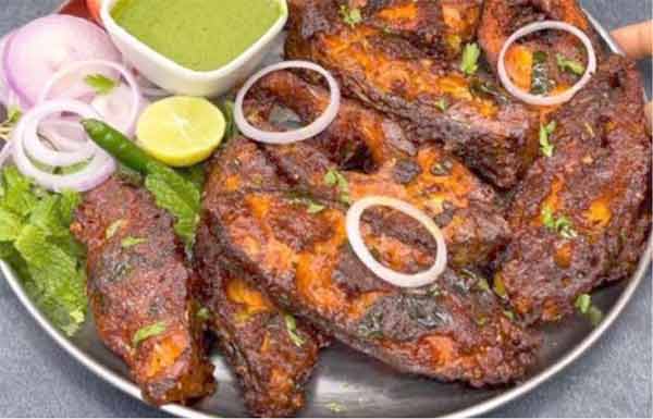 اجزا :مچھلی کے قتلے ایک کلو، نمک حسبِ ذائقہ، لہسن دو کھانے کے چمچہ، پیاز دو عدد درمیانی، ٹماٹر تین سے چار عدد، کٹی ہوئی لال مرچ ایک کھانے کا