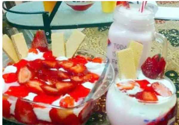 اجزا : دودھ ایک کلو، اسٹرابیری ایک کپ، اسٹرابیری جیلی ایک پیکٹ، اسٹرابیری کسٹرڈ دو کھانے کے چمچے، کارن فلوردو کھانے کے چمچے، چینی ایک کپ، کریم ایک کپ۔ترکیب :اسٹرابیری