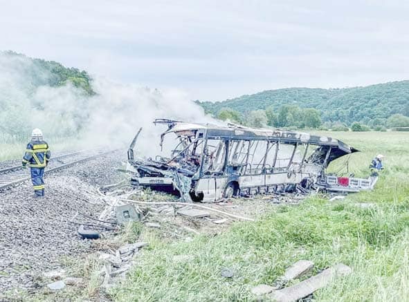 برلن : جرمنی میں ٹرین اور بس کے تصادم کے نتیجے ٹرین بھی پٹڑی سے اتر گئی،جب کہ بس مکمل طور پر تباہ ہوگئی۔ واقعہ جنوبی جرمنی میں ریلوے پھاٹک