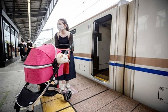 ٹوکیو : جاپان کی بلٹ ٹرینوں میں عام طور پر کتوں کو پنجرے میں بند ہو کر سفر کرنا پڑتا ہے، لیکن ہفتہ کے روز پالتو جانوروں کے لیے خصوصی