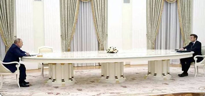 ماسکو ۔ روس نے کہا ہے کہ صدر ولادیمیر پوٹن سے ملاقات کے دوران فرانسیسی صدر میکرون کو غیر معمولی طور پر لمبی میز پر بٹھانے کی وجہ میکروں کی