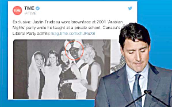 ٭ مشہور میگزین ٹائم کو حاصل ایک تصویر میں دیکھا جا سکتا ہے کہ کناڈا کے وزیراعظم جسٹن ٹروڈو نے اسکول کی ایک تقریب میں ’براؤن فیس‘ کاسٹیوم پہنا ہوا