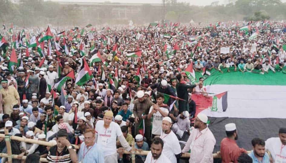 ڈھاکہ: بنگلہ دیش کے دارالحکومت ڈھاکہ میں فلسطینیوں سے اظہار یگانگت کا بڑا مظاہرہ کیا گیا۔تفصیلات کے مطابق ہفتہ کے روز ڈھاکہ کے سہروردی پارک میں فلسطینیوں سے اظہار یگانگت